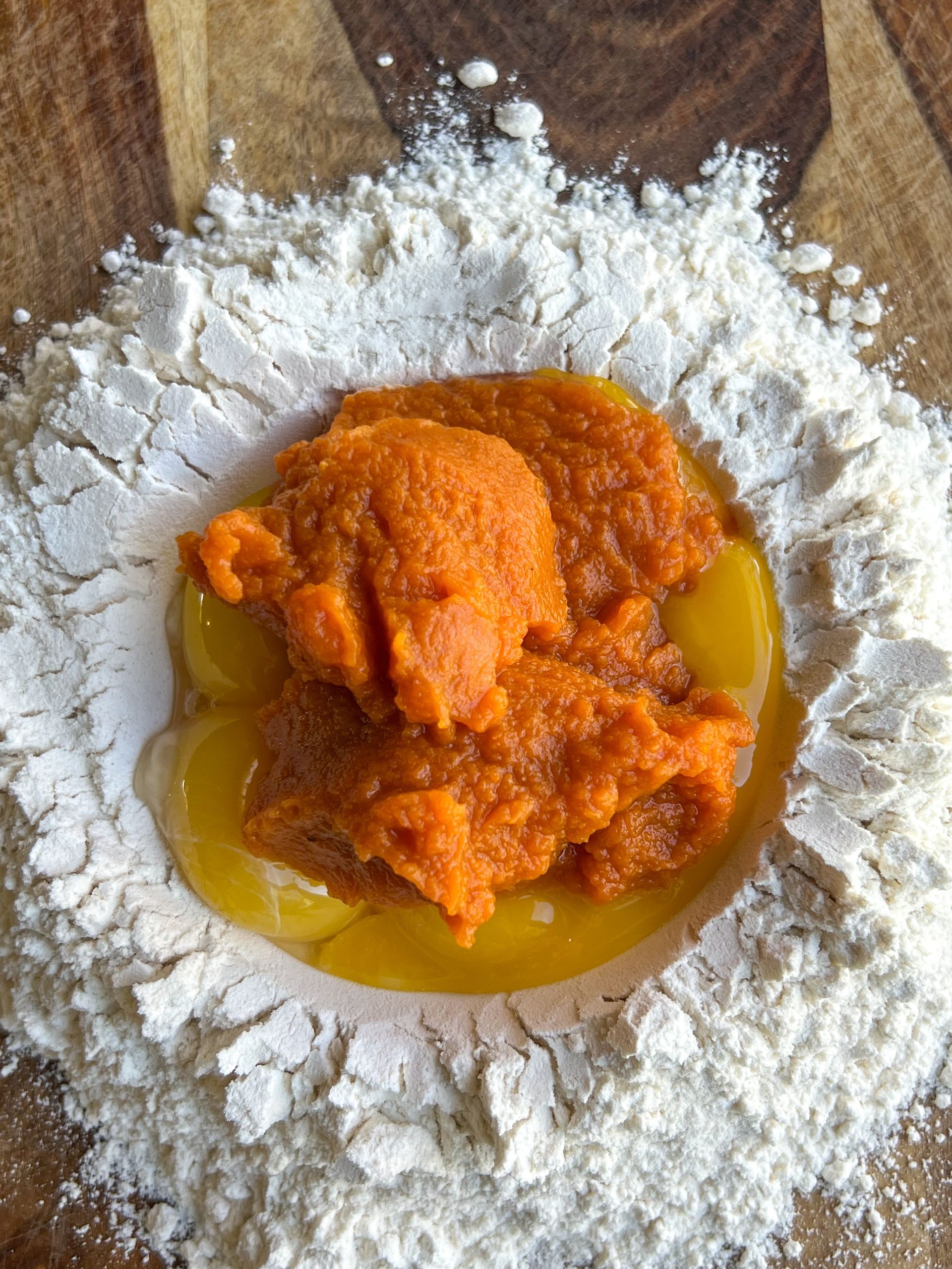 1.On a clean surface, pile your flour and make a well in the center. Add eggs + pumpkin. Using a fork, carefully drag the inside ring of flour into the center and mix to gradually incorporate all flour. Use a dough cutter or your hands to knead as dough begins to form.