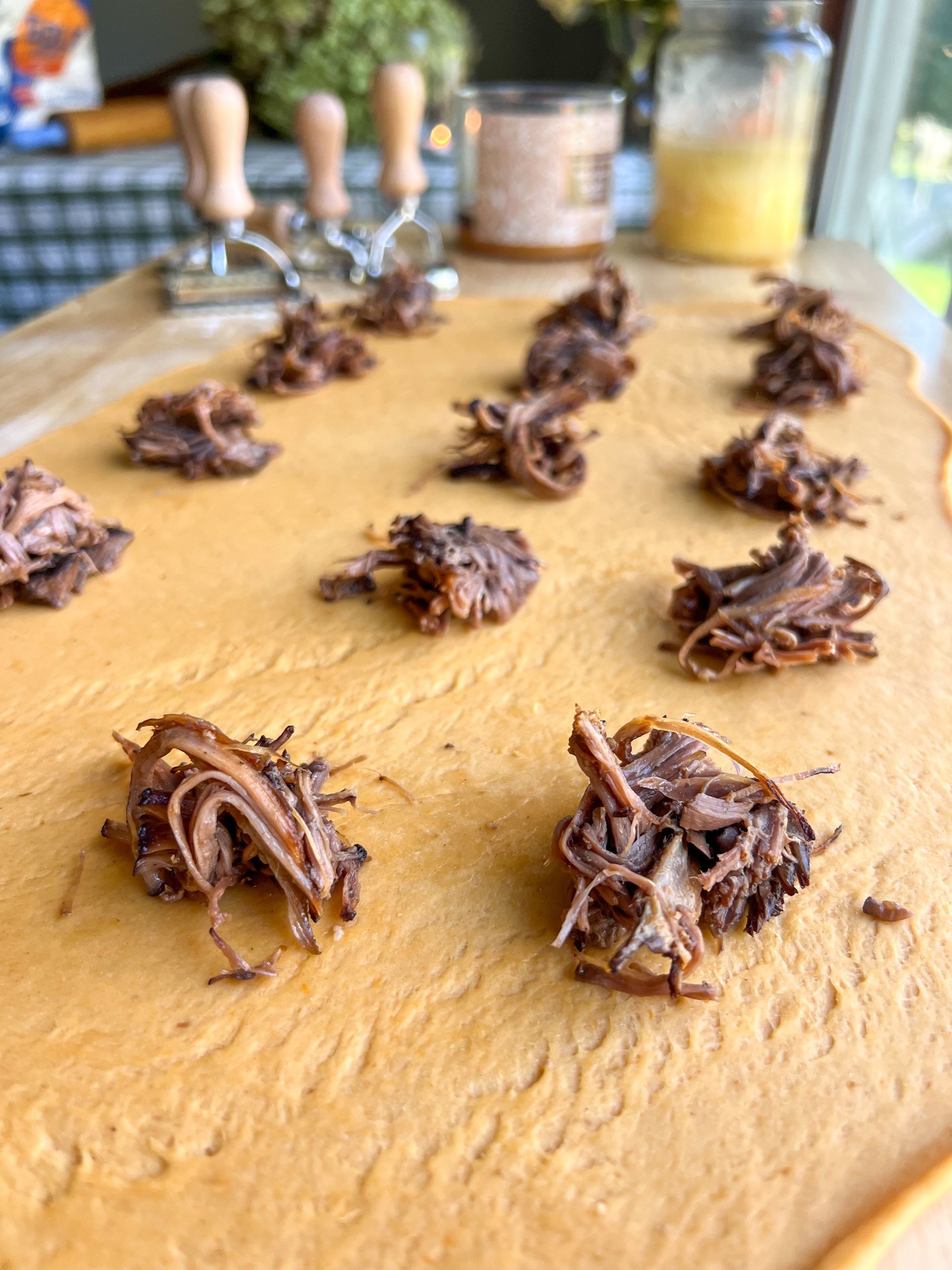 3. Use your ravioli cutter to measure how far you need to space out the filling. Arrange quarter sized amounts of shredded beef evenly spaced on the bottom ravioli sheet. Once full, lay the top sheet over top and stamp out your raviolis. Combine dough scraps and re roll to make more raviolis until you’ve used it all.